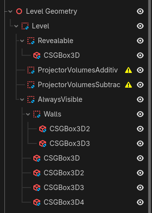We used Godot for this project so that we could make use of it's CSG (Constructive Solid Geometry) features for the terrain features. All the terrain is made up of CSG geometry, and the projectors have a pyramid in front of them with a CSG modifier object. We set up objects in the hierarchy to parent terrain to, so that any platform that should be hidden until revealed by a projector can be a CSG object as a child of the Revealable node. All subtractive terrain in the game has to first be revealed by an additive projector, which is why some levels feature unobtainable projectors.